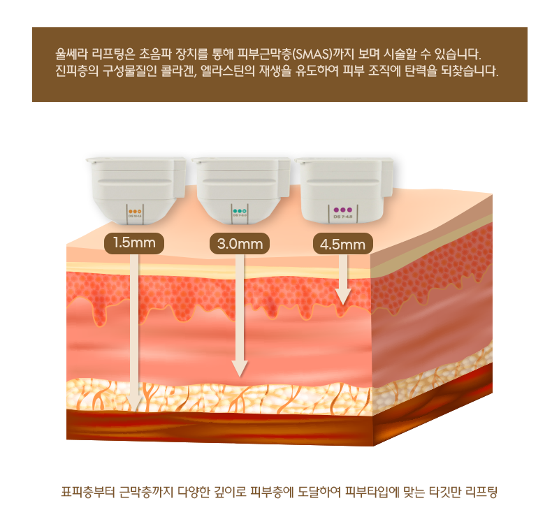 피부의 상태에 맞게 3종류의 트랜스듀서를 적절히 믹스하여 맞춤 울쎄라 시술을 진행합니다. 초음파를 이용하여 SMAS층의 탄력을 유도해 자연스러운 리프팅과 콜라겐 재생을 촉진합니다.